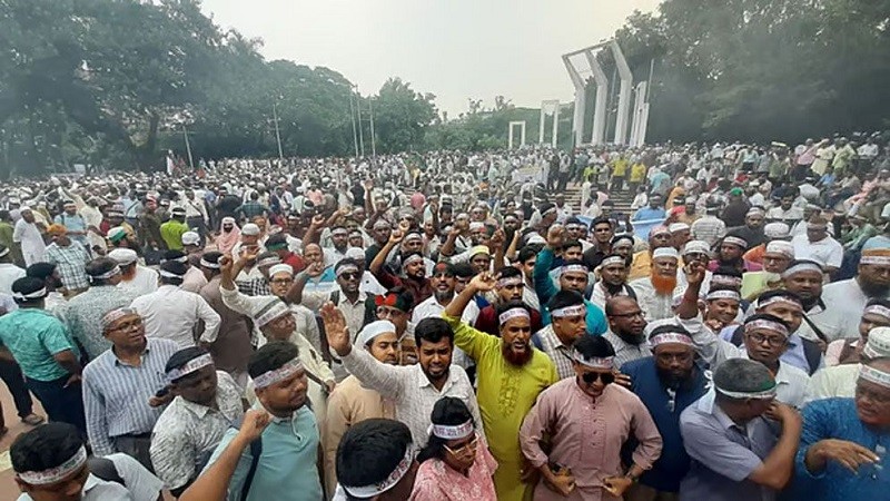 দুপুর ১টায় রাজধানীর কেন্দ্রীয় শহীদ মিনারে গিয়ে দেখা যায়, সেখানে কয়েক হাজার শিক্ষক-কর্মচারী জড়ো হয়েছেন। তারা স্লোগান দিচ্ছেন, ‘২০ শতাংশ বাড়ি ভাড়া, দিতে হবে দিতে হবে’, ‘বাংলার শিক্ষক, এক হও এক হও’, ‘শিক্ষকদের সঙ্গে প্রহসন, মানি না মানি না’ প্রভৃতি।