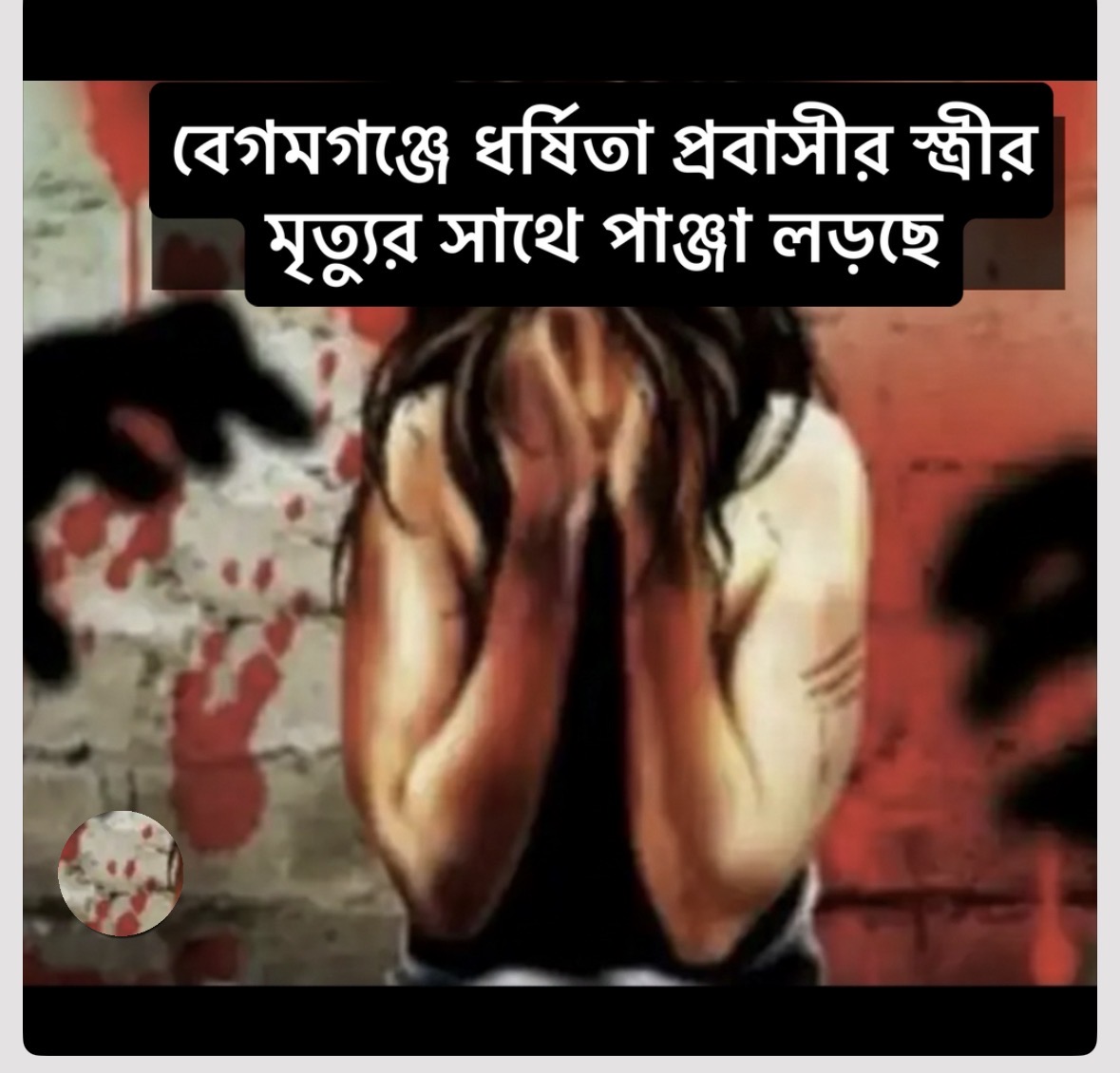 নোয়াখালীর বেগমগঞ্জে শনিবার বিকেলে প্রকাশ্যে জোর পূবর্ক ধর্ষনের শিকার প্রবাসীর স্ত্রী ও এক সন্তানের জননী (২৩) লোকলজ্জা সহ্য করতে না পেরে বিষপানে আত্নহত্যার চেষ্টার দুই দিনেও উন্নতি না হওয়ায় হাসপাতালে মৃত্যুর সাথে পাঞ্জা লড়ছে।
