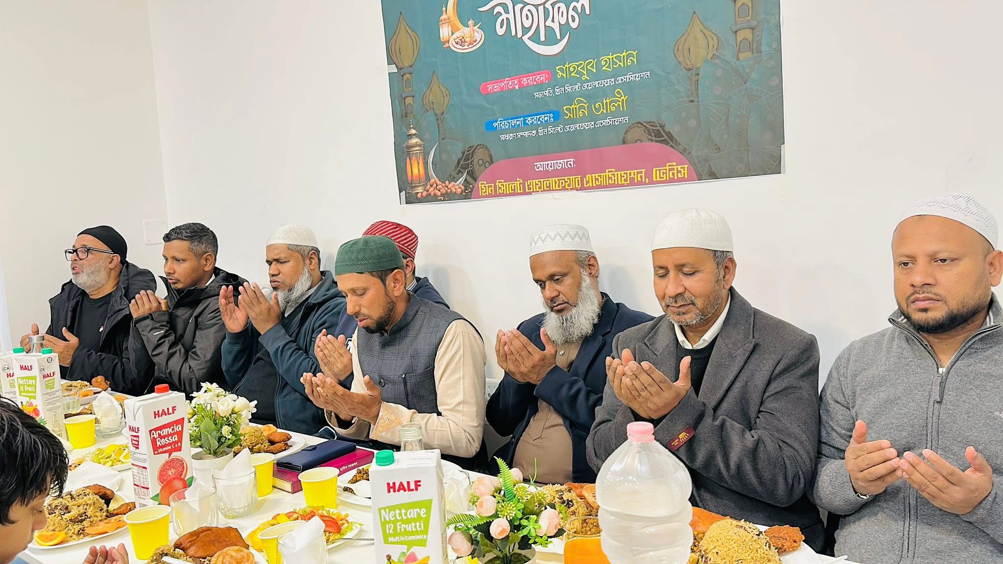 ইফতারের আগে মাহফিলে বিশেষ দোয়া ও মোনাজাত পরিচালনা করা হয়।মোনাজাতে দেশ, জাতি এবং মুসলিম উম্মাহর শান্তি ও সমৃদ্ধি কামনা করা হয়।ইফতার মাহফিলে ভেনিসের বিশিষ্ট ব্যবসায়ী,সংবাদকর্মী এবং বিপুল সংখ্যক প্রবাসী বাংলাদেশি অংশগ্রহণ করেন।