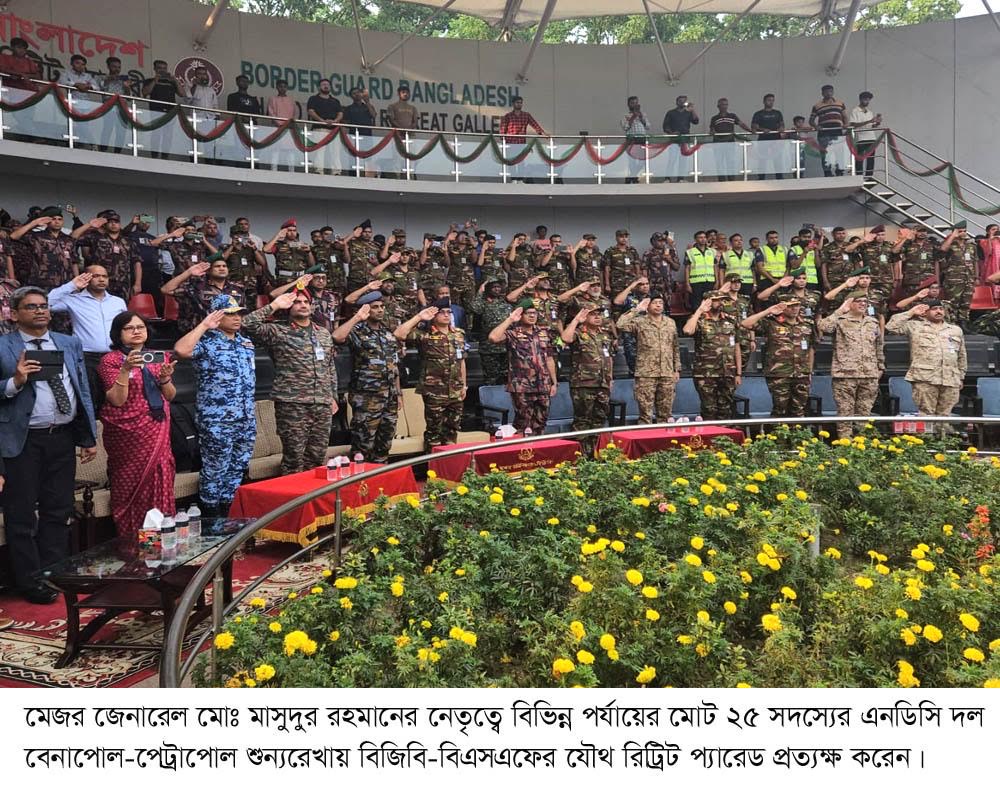 যশোর ৪৯ বিজিবি ব্যাটালিয়নের অধিনায়ক লেফটেন্যান্ট কর্নেল গোলাম মোহাম্মদ সাইফুল আলম খান বিষয়টি নিশ্চিত করে জানান, মেজর জেনারেল মোঃ মাসুদুর রহমানের নেতৃত্বে বিভিন্ন পর্যায়ের মোট ২৫ সদস্যের এনডিসি প্রতিনিধি দল বেনাপোল সদর ক্যাম্পে আয়োজিত এক কনফারেন্সে অংশ নিয়ে সংশ্লিষ্ট বিষয়ে ব্রিফিং গ্রহণ করে। ব্রিফিং শেষে তারা বেনাপোল আইসিপি ও স্থলবন্দরের বিভিন্ন গুরুত্বপূর্ণ স্থাপনা ও কার্গো ইয়ার্ড পরিদর্শন করেন এবং সীমান্ত এলাকায় বিজিবি-বিএসএফের যৌথ রিট্রিট প্যারেড প্রত্যক্ষ করেন।